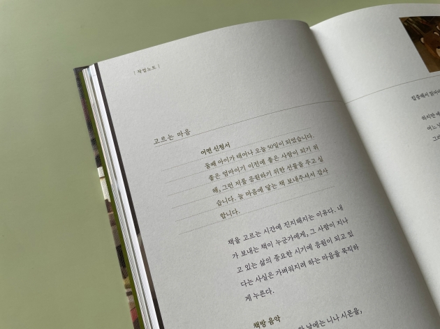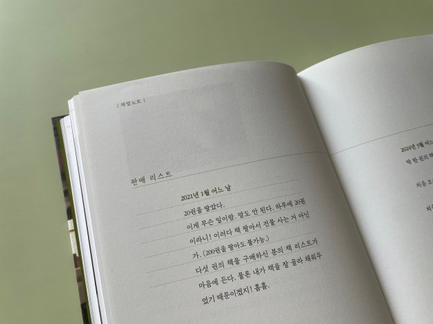 한샘 책방 노트북에 항상 열려 있는 메모장 어플에 <작업노트> 폴더가 있습니다. 정말로 그때그때 업무 중 생각나는 것이나 기록하고 싶은 상황을 적어요. 대부분 짧은 문장으로 되어 있고 휘리릭 적는 것들이기에 꾸미지 않은 기록입니다. 생각하지 않고 적었기 때문에 솔직할 수밖에 없었을 테고요. 책방을 하며 순간적으로 느끼는 감정을 그대로 담고 싶었어요. 하지만 정말 책에 실으신다는 걸까? 실을 수 있는 글일까? 하는 마음으로 보낸 것인데, 편집자님이 와하하 웃으시며 너무 좋아해 주셔서 기쁘고 놀랍기도 했어요. 슬프고 웃기고를 느껴주셨다니 기쁩니다. 그런 순간들에 적은 것이니까요.